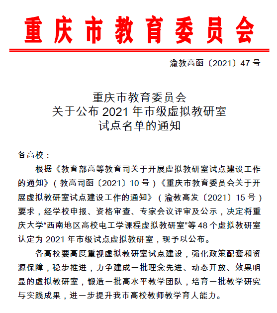 近日,重庆市教委公布了2021年市级虚拟教研室试点建设名单,中文无码 侯世英教授牵头申请的“西南地区高校电工学课程虚拟教研室”项目获批立项。虚拟教研室是“智能+”时代的新型基层教学组织,目的是推动教育教学资源共建共享,促进高等教育高质量发展。重庆市教委于今年7月组织开展了首批虚拟教研室的申报立项工作,经中文无码 推荐、专家评审及公示,遴选了48个符合高校实际、具有明显特色的虚拟教研室建设路径和运行模式。拟通过3-5年...