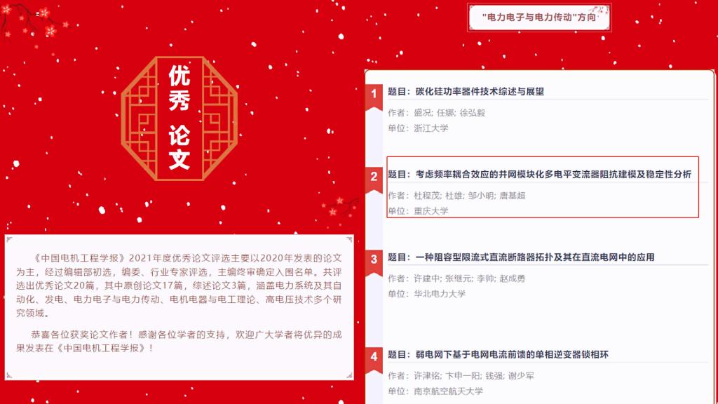 近日,《中国电机工程学报》经过编辑部初选,编委、行业专家评选,主编终审确定入围名单。共评选出优秀论文20篇,其中原创论文17篇,综述论文3篇,涵盖电力系统及其自动化、发电、电力电子与电力传动、电机电器与电工理论、高电压技术多个研究领域。中文无码 杜雄教授针对模块化多电平变流器并网稳定性开展了深入研究,通过揭示变流器与电网之间的频率耦合效应,建立等效阻抗模型,准确评估了模块化多电平变流器并网系统的振荡风险,...