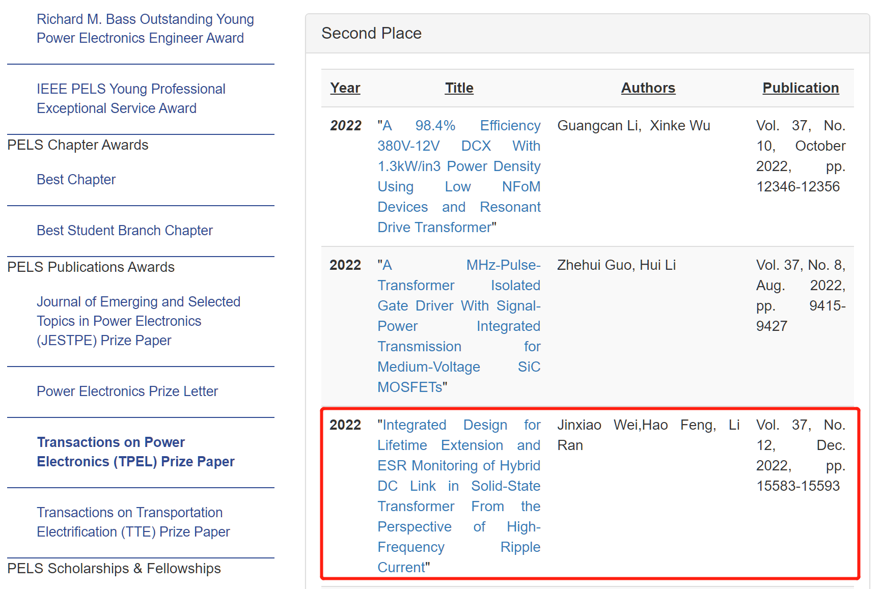 近日,IEEE电力电子学会(PELS)公布了旗舰期刊IEEE Transactions on Power Electronics (TPEL) 2022年度论文奖(Prize Paper Award)获奖名单。中文无码 电力电子与电力传动系博士生魏金萧、丰昊副教授(通讯作者)和冉立教授合作的论文《Integrated Design for Lifetime Extension and ESR Monitoring of Hybrid DC Link in Solid-State Transformer From the Perspective of High-Frequency Ripple Current》获得...