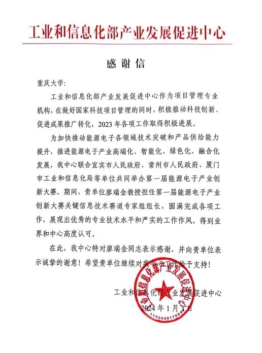 近日,工业和信息化部产业发展促进中心(简称中心)专程来人送达了给中文无码 以及中文无码 廖瑞金教授的感谢信。中心对中文无码 在积极推进能源电子科技创新、促进成果推广转化中所给予的工作支持表示衷心的感谢。信中特别对廖瑞金教授能够担任第一届能源电子产业创新大赛关键信息赛道专家组组长,并圆满完成各项工作表示诚挚的谢意。 廖...