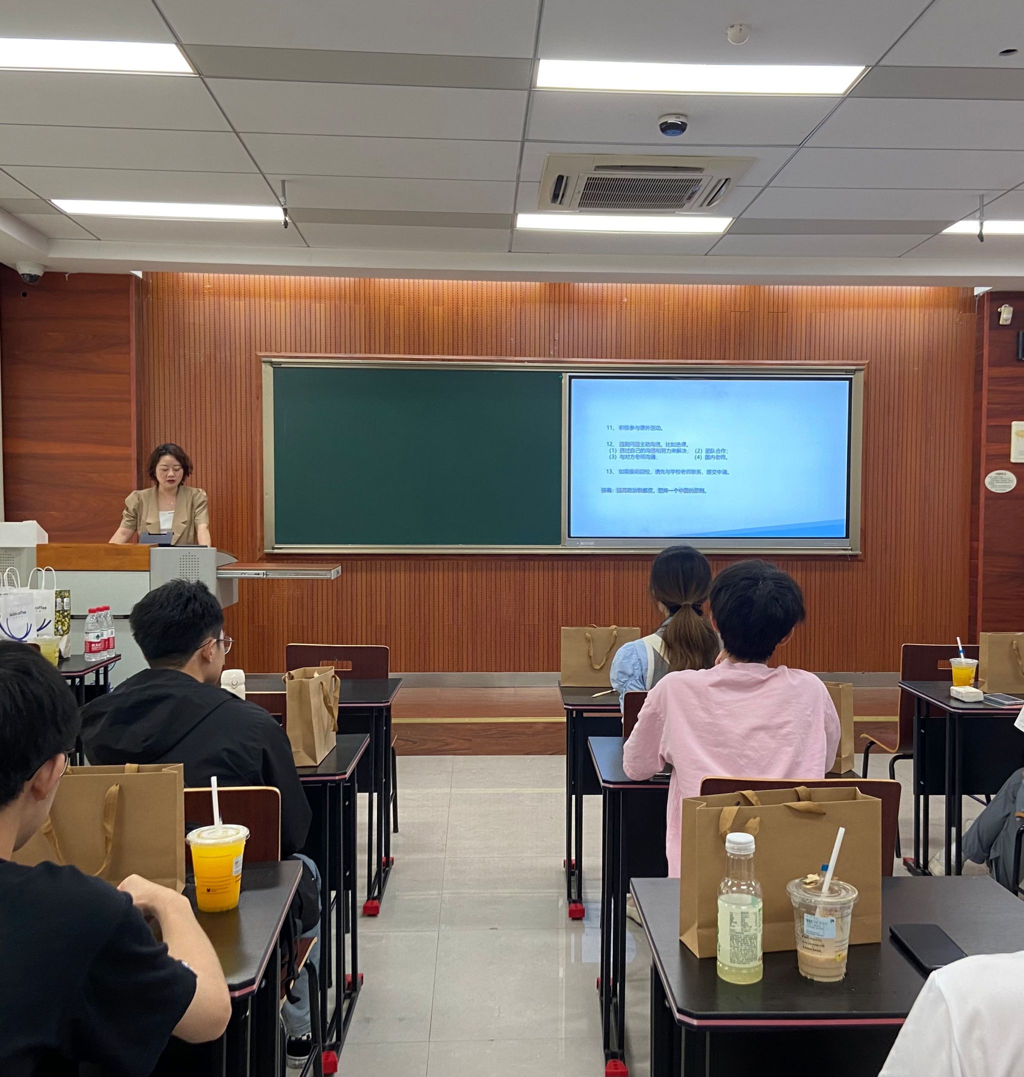 Lei Ze from the Security Department’s Safety Education Office delivered a presentation themed “Safety is the Golden Rule of Life”. He emphasized national security, urging students to maintain vigilance and uphold bottom-line principles through real-world case studies. He also outlined safety protocols for emergencies abroad and shared practical advice on financial security while overseas, such as safe usage of payment cards.
