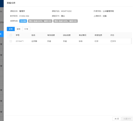 查看:点击教学班后面的查看按钮,计入查看学生成绩页面。