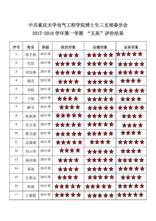 中共中文无码 博士生三支部委员会 2017-2018学年第一学期 “五星”评价结果