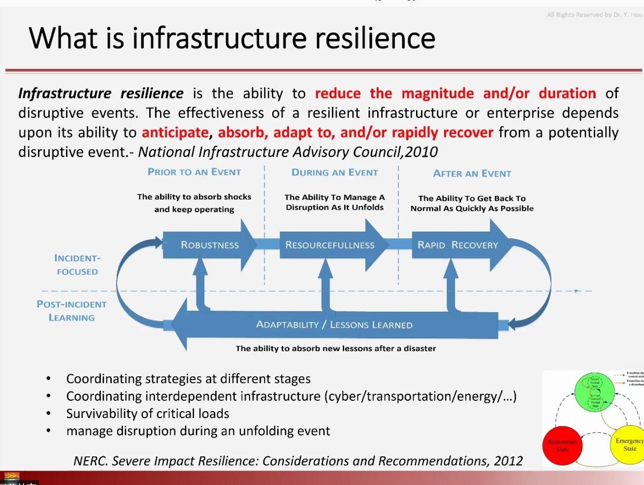 除此之外,侯教授还对信息物理系统进行了简要介绍。侯教授强调,弹性系统是满足“新常态”条件的关键要求,其弹性运行包含连续反应、在极端事件各阶段的协调运作策略等新的维度,想要建设一个鲁棒性强的系统并确保关键部件的可生存性,则需要更新当前的运营和规划方法。