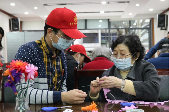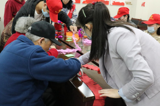 活动开始之前,志愿者们和每一位老人进行小组配对,亲手教给他们制作纸花的技巧,一并协助他们完成从剪纸、折叠、粘胶、成花等一系列操作步骤。活动进行之中,军休干部们在手上忙活的同时也在与志愿者聊天,谈论自己年轻时候的轶事,中年时候有关生活、工作上的趣闻,并不断叮咛勉励在场的志愿者们要努力学习,争做国家栋梁,为国家创造荣光。