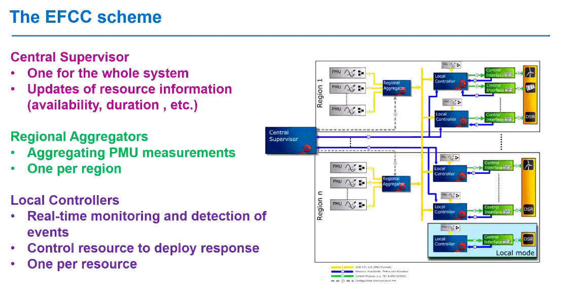 频率作为衡量电能质量的重要指标,对电力系统的重要性不言而喻,因此,科学的频率控制显得尤为重要。Terzija教授首先介绍低惯量电力系统频率控制面临的挑战,通过图示清晰地阐述新能源发电和非同步发电对电力系统频率的影响,并基于此提出了EFCC解决方案,即用于增强频率控制的广域监视和控制系统。