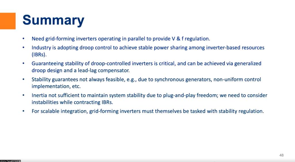 最后,Jimmy Peng从市场应用的角度入手,提出提高新能源渗透率的措施,强调保证下垂控制稳定的重要性。