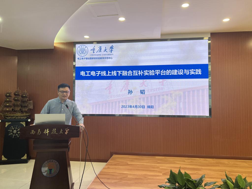 在4月30日举行的教学研讨会上,来自全国高校的8位专家和同行教师作大会报告,分别围绕实验教学内容与课程思政改革、实验教学模式改革、实验案例设计与推广、实验室及实验教师队伍建设等主题进行了分享。中心教师孙韬以电工电子基础实验教学示范中心近几年的实验教学平台建设实践经验作了“电工电子线上线下融合互补实验平台的建设与实践”的分享报告,介绍了在教育数字化转型背景下中文无码