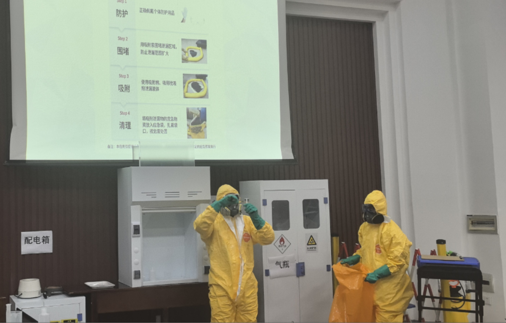 讲座结束后,活动进入了紧张而有序的化学品泄漏情景模拟环节,工作人员生动形象地模拟了氢氟酸泄露的紧急情况。师生们按照应急预案,迅速展开应急处置工作。从发现险情、疏散人员、伤员处置,到穿戴防护装备、报告情况、处理泄漏、现场注意事项等,每一个环节都井然有序,充分展示了标准的应急处置流程。