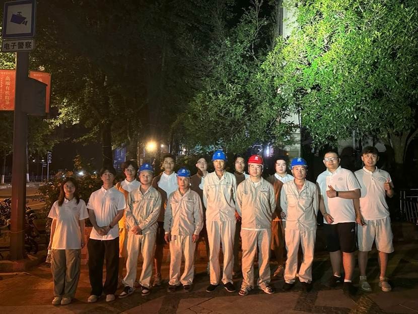 凌晨4点,随着最后一个螺丝拧紧,整体维修工作顺利完成。此时天边已露微光,5位电网抢修人员与10位实践团成员并肩站在设备旁合影,镜头定格下这群守护夏日清凉的身影。